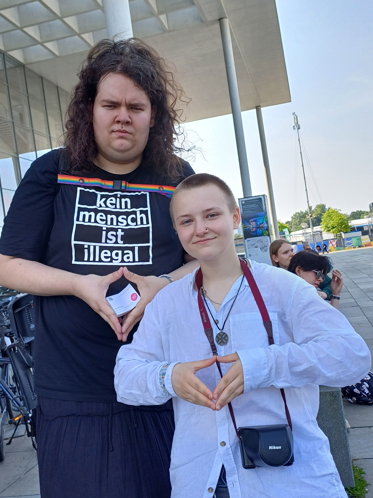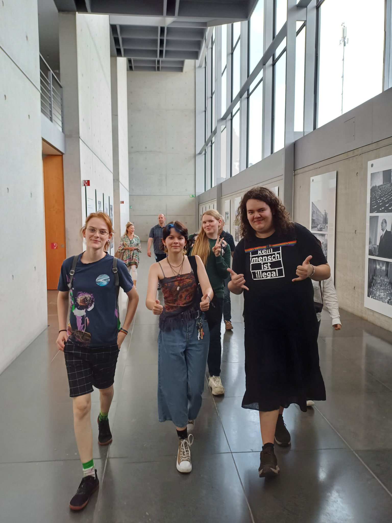 Bereits morgens um 07:30 Uhr ging es mit unserer Reisegruppe aus queeren Jugendlichen mit dem ICE aus Wolfsburg nach Berlin. Vormittags erreichten wir dann den Bundestag. Dort hatten wir eine spannende Diskussion mit den Mitarbeitenden des MdBs. Themen waren unter anderem die aktuelle Bürgergelddebatte und das alltägliche politische Geschäft in Berlin. Nach dem Mittagessen hatten wir noch das Glück eine Plenardebatte beobachten zu können. Thema war hier das neue Gesetz zur Entlastung des Gesundheitssystems. Es folgte der obligatorische Besuch der Dachterrasse des Reichstagsgebäudes, ehe die Jugendlichen in Kleingruppen Berlin unsicher machen konnten.