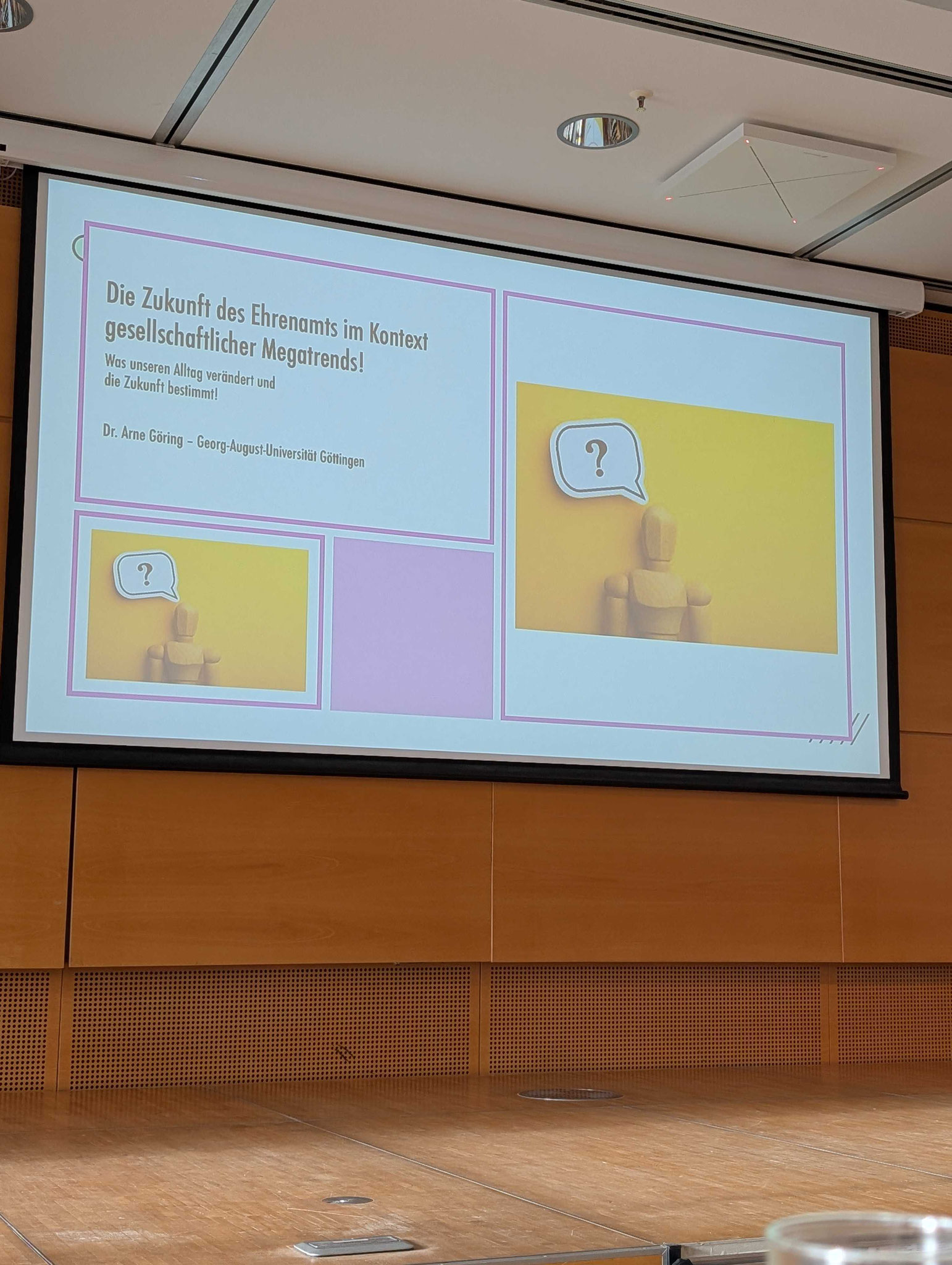 Bevor es zur eigentlichen Vernetzung ging, wurde ein Vortrag gehalten, in dem erklärt wurde, wie das Ehrenamt sich verändern muss, um zukünftig weiterhin für alle attraktiv zu sein. Die Megatrends, die sich gebildet haben und nun großer Teil der Gesellschaft sind, spielen dabei eine große Rolle. Leider kamen beim Thema "Gendershift" einige Gegenstimmen und auch manche Aussagen wirkten teilweise queerfeindlich.