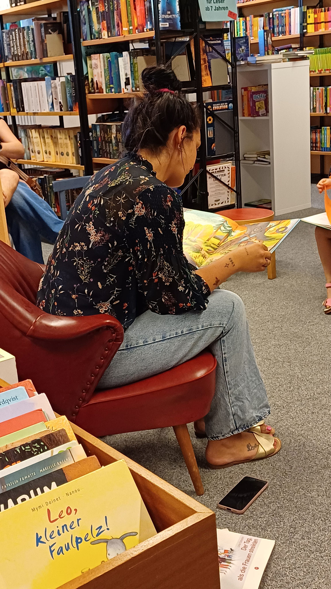 Von 15 bis 16 Uhr lauschten über zehn Kinder den Geschichten über Liebe, Familie und Vielfalt. Es war toll zu sehen, wie interessiert die kleinen Zuhörer*innen den Erzählungen folgten.