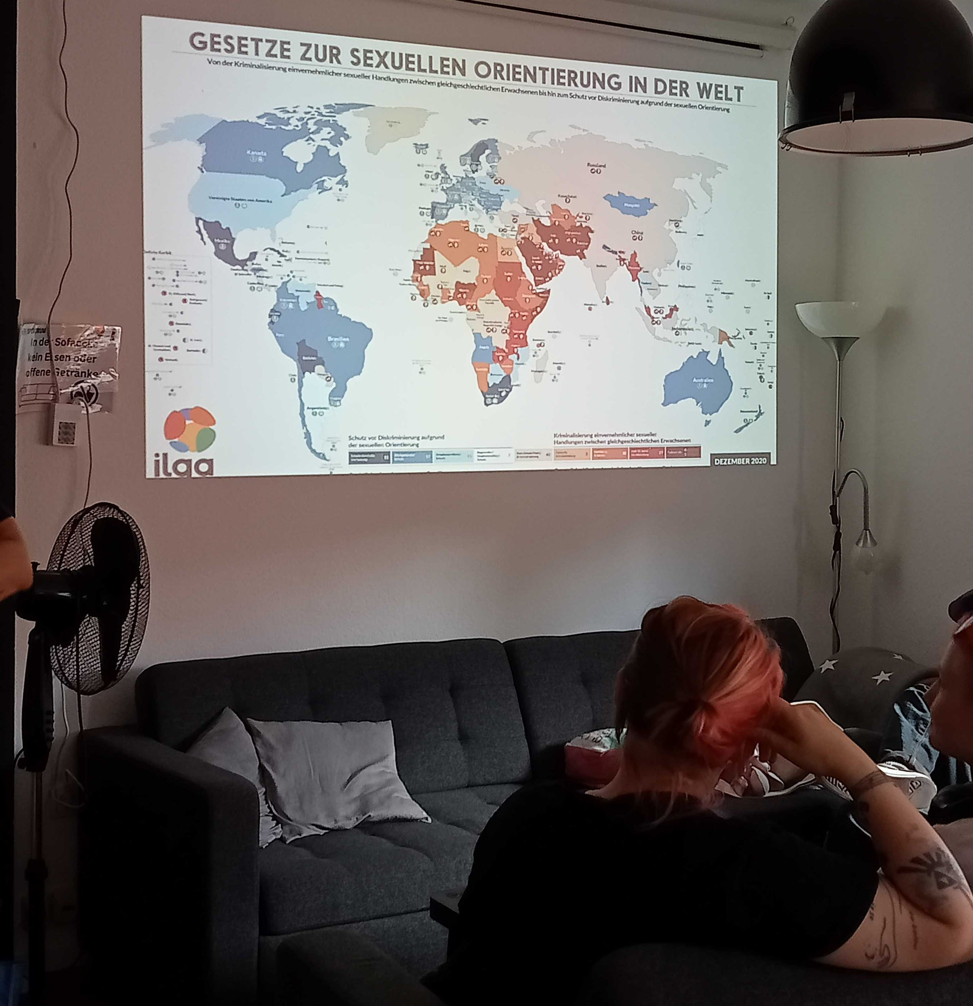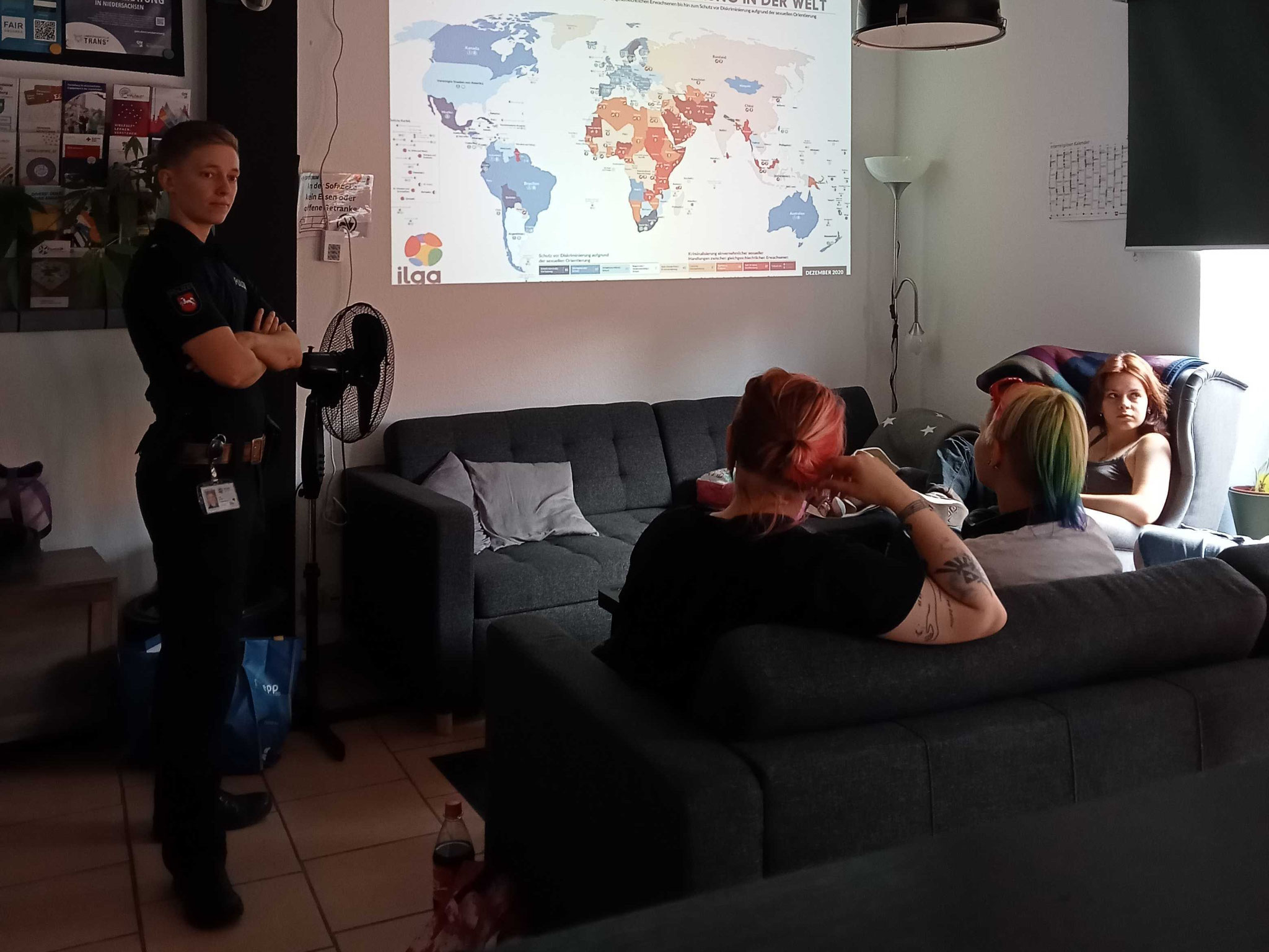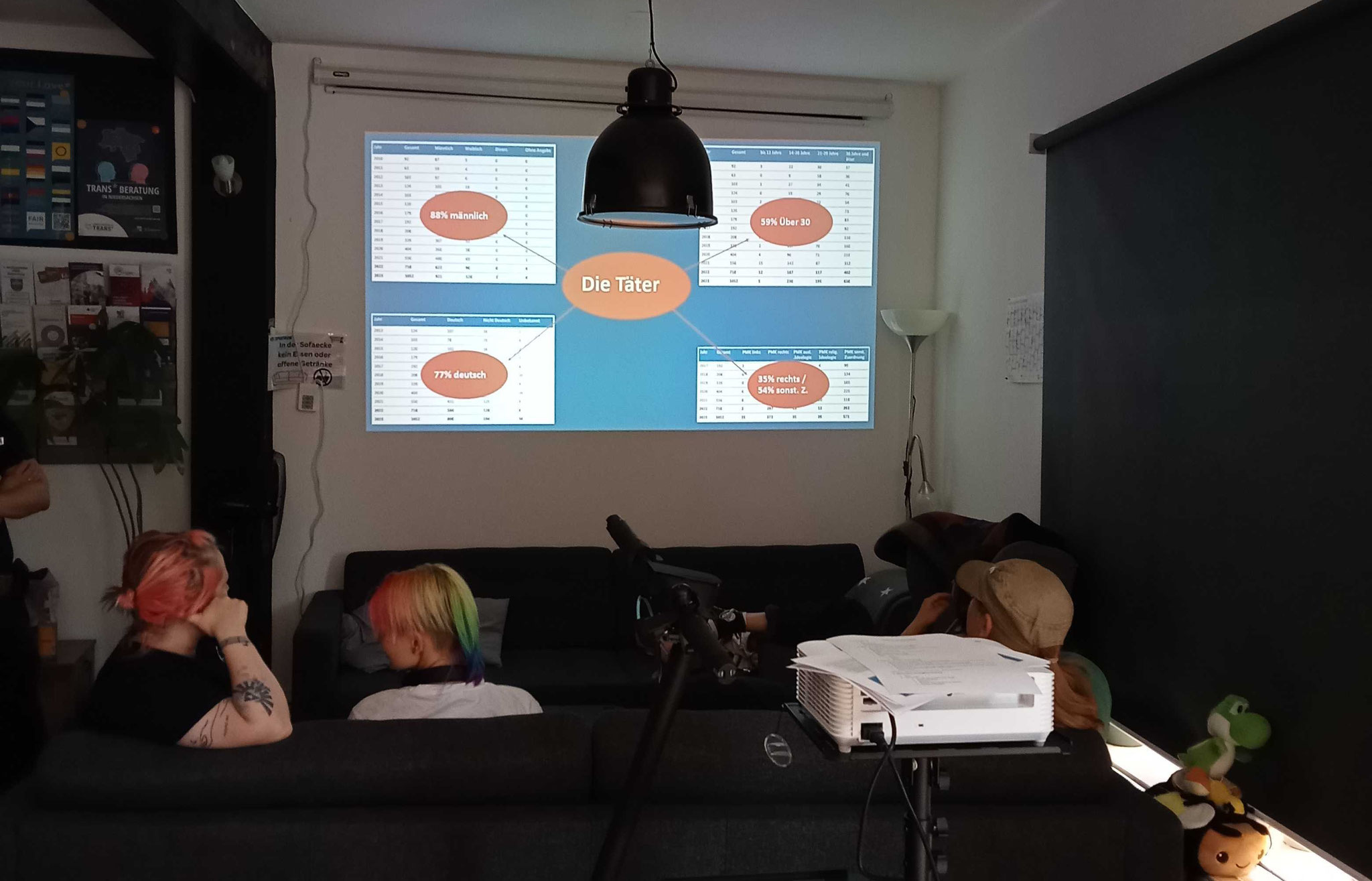 den kommenden Informationen. Jules und Vici erklärten uns, was genau politisch motivierte Kriminalität /Hasskriminalität ist und worin der Unterschied zwischen herkömmlichen und queerfeindlichen