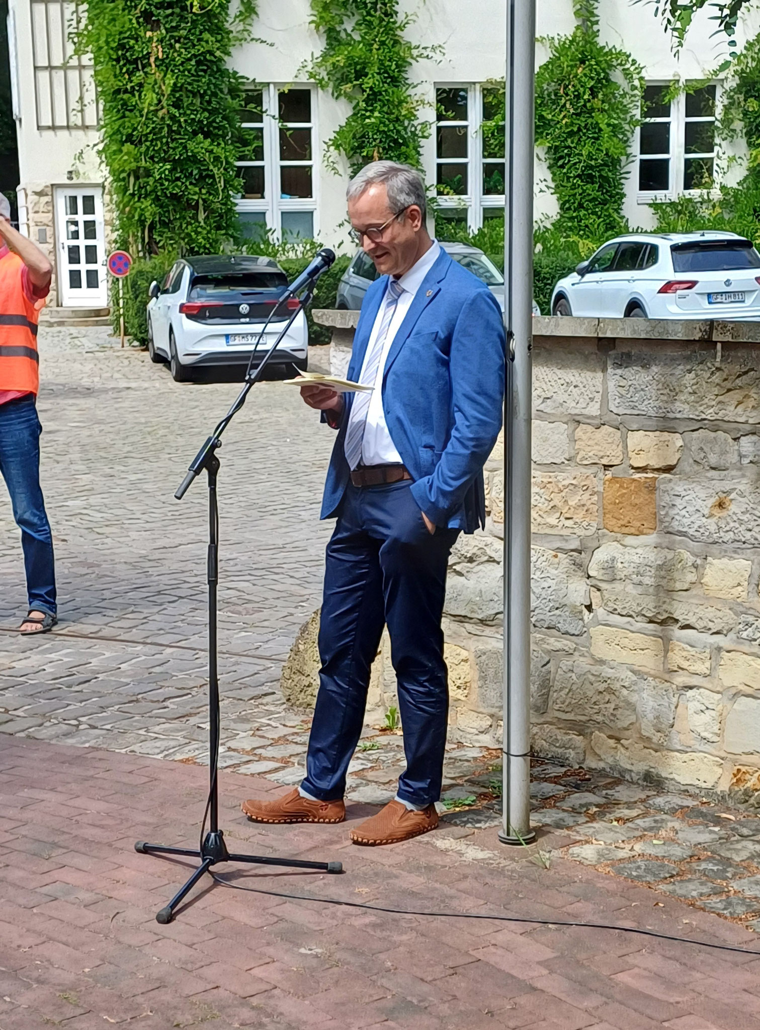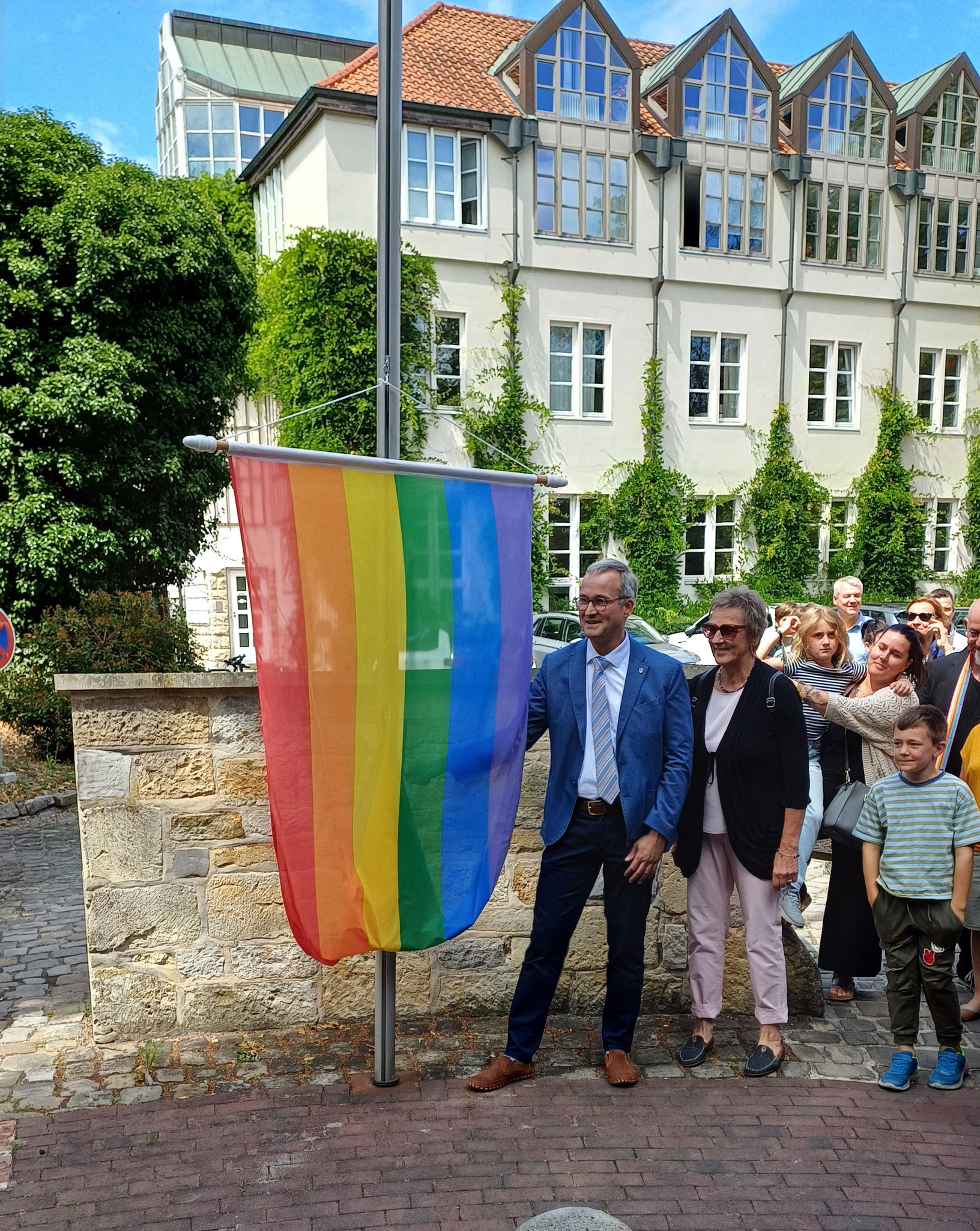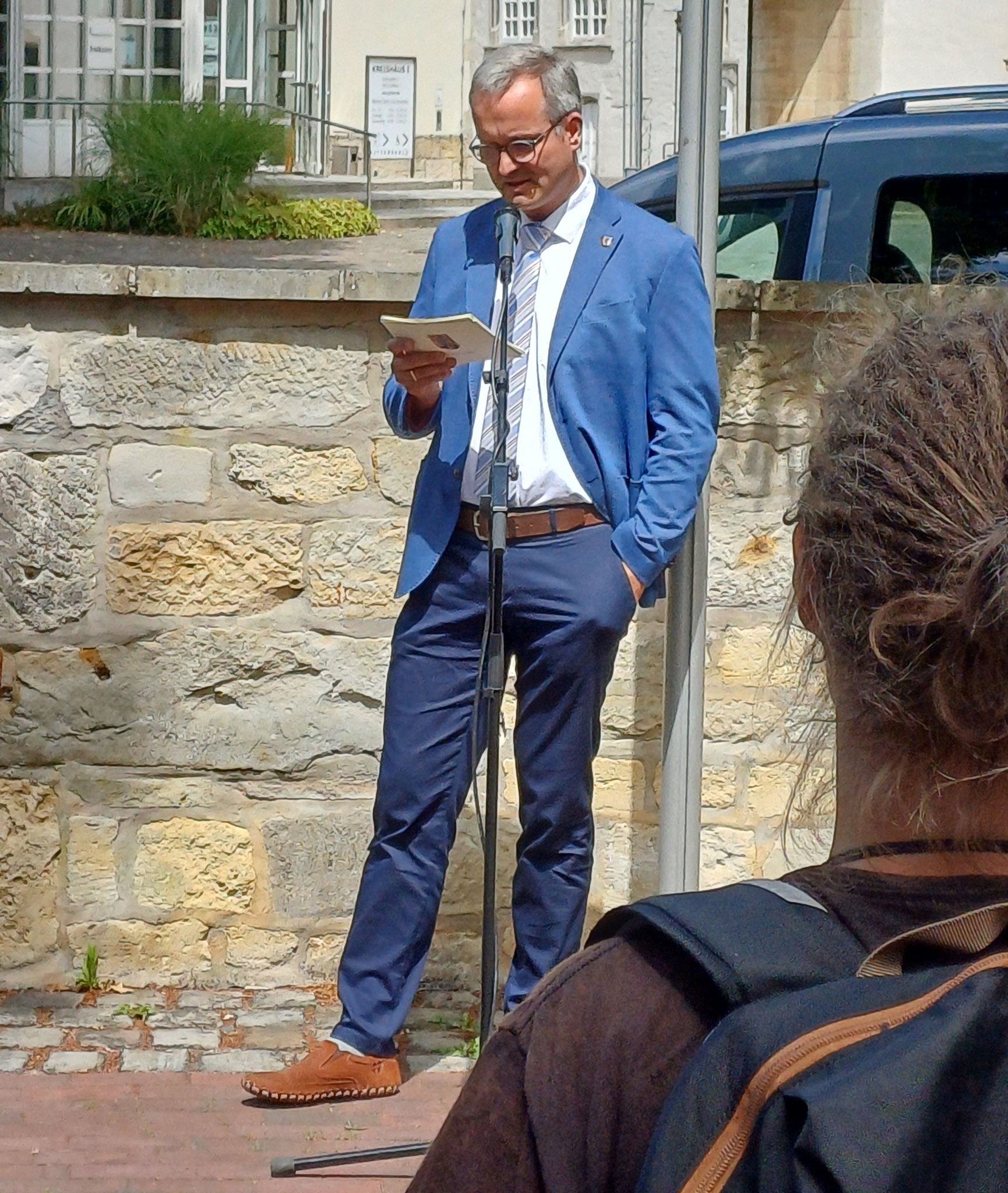 Die Veranstaltung begann mit einer Rede des neuen Ersten Kreisrats, Dominik Meyer zu Schlochtern. Er erklärte die tiefere Bedeutung der Farben der Regenbogenflagge und mahnte eindringlich, indem er auf die schreckliche Verfolgung Homosexueller in der NS-Zeit aufmerksam machte.