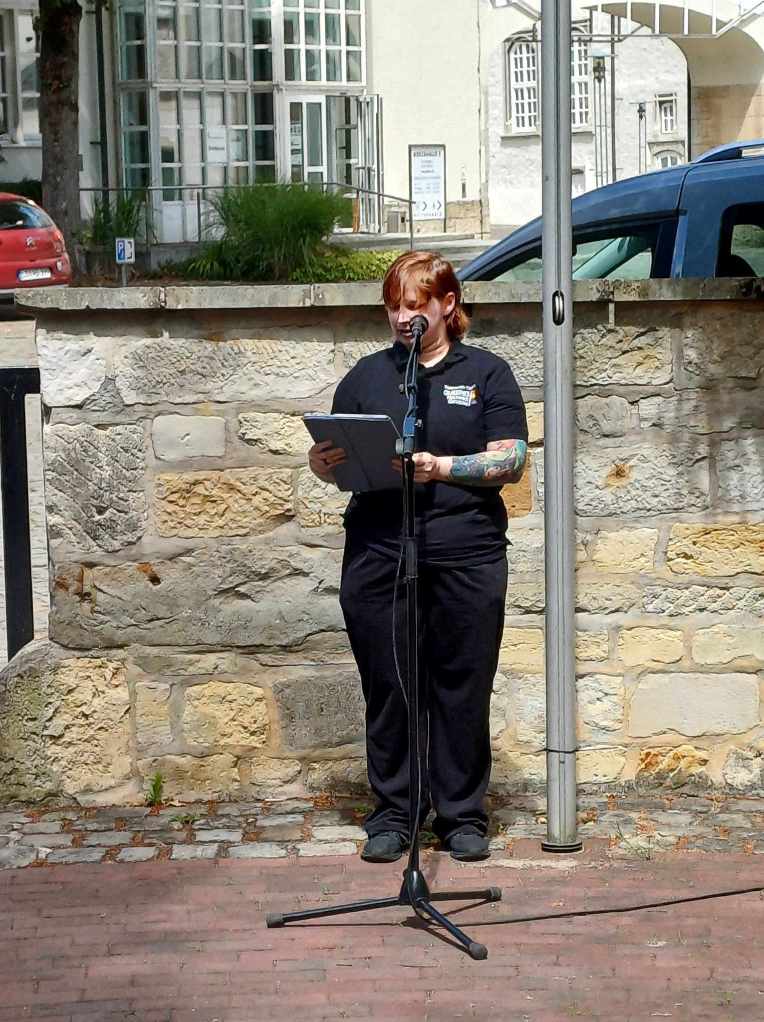 Als Nächstes ergriff Alex, Vorstandsmitglied des Queeren Netzwerks Gifhorn, das Wort. Sie nutzte die Gelegenheit, um auf die fehlende Wertschätzung seitens der lokalen Politik für die wichtige queere Arbeit im Landkreis hinzuweisen. Bedauernd stellte sie fest, dass der diesjährige CSD nicht von einem breiten Schulterschluss aller demokratischen Parteien getragen wird.